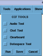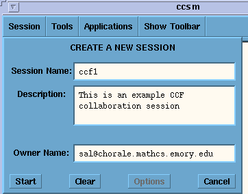 ccsm is the session manager portion of the ccf. ccsm creates a "virtual desktop" which provides an interface to collaborative tools (audio, clearboard, chat, and dataspace) and allows users to share applications.