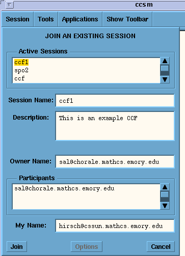 A ccfx is currently started on the local machine when a session is joined but other configurations are possible. It is possible for a session participant to view and remotely manipulate applications in a session without a ccfx running but then no applications can be launched locally.